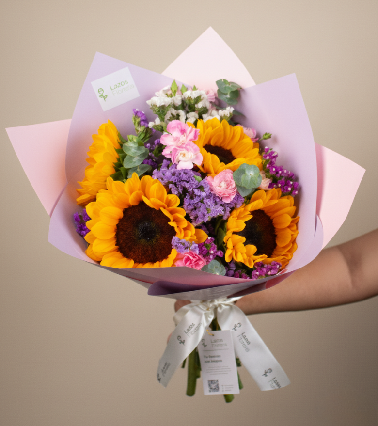 Irradia felicidad y calidez con "Destello Vital", una composición enérgica diseñada para iluminar el alma. Este vibrante ramo captura la fuerza inigualable de los girasoles, que brillan intensamente sobre un delicado contraste de flores silvestres en tonos lilas y rosados. La frescura del eucalipto aporta un toque aromático y natural, creando un equilibrio perfecto entre alegría intensa y dulzura campestre. Es el regalo ideal para celebrar la vida, levantar el ánimo o transmitir admiración sincera con un gesto lleno de luz. Cuidadosamente envuelto en nuestra presentación distintiva, de Lazos Florería.