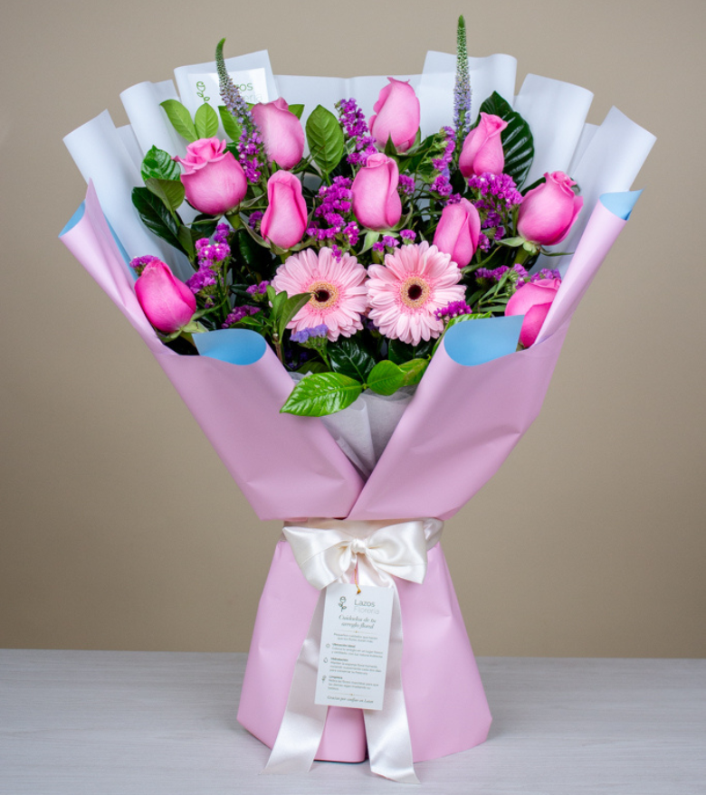 Envuelve cada momento en suavidad con "Ternura Primaveral", una composición equilibrada que celebra la delicadeza y el afecto sincero. Este diseño destaca por la armonía entre rosas premium en tonos rosados y la elegancia de gerberas a juego, creando una atmósfera de calma y alegría. Complementado con acentos morados de statice y espigas silvestres que aportan altura y frescura natural, este ramo es el detalle perfecto para expresar cariño, gratitud o celebrar una ocasión especial con sofisticación. Presentado en una impecable envoltura rosa con un lazo de seda blanco.