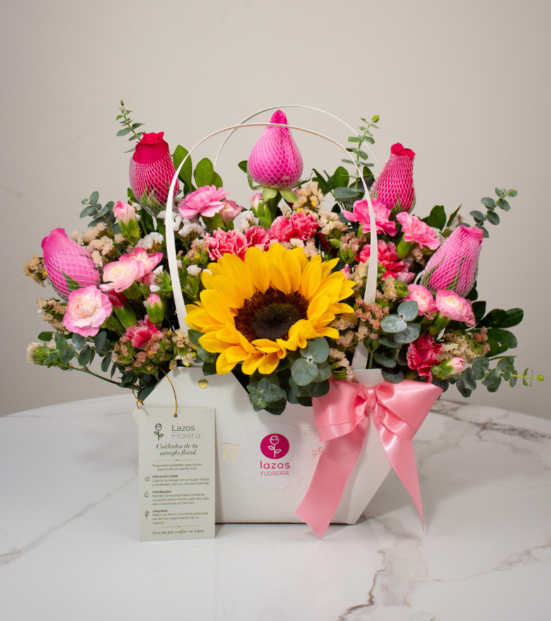 Sorprende con "Tributo a tu Fuerza", un diseño alegre y original que lleva la frescura de un jardín directamente a sus manos. Esta hermosa composición destaca un girasol radiante en el centro, bellamente rodeado por la ternura de las rosas y delicadas flores en tonos rosados, creando una explosión de color y vitalidad. Su presentación única en una base tipo cartera lo convierte en un detalle moderno, coqueto y sofisticado. Es la elección perfecta para deslumbrar en un cumpleaños, celebrar una fecha especial o simplemente regalar una sonrisa inolvidable a través del arte de crear emociones. Elaborado con el cuidado y la dedicación que caracterizan a Lazos Florería.